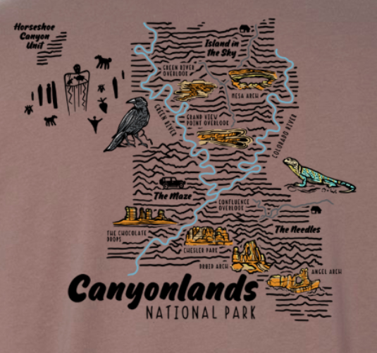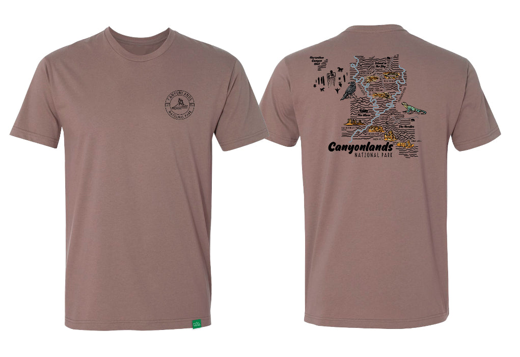 Explore the rugged beauty of Canyonlands National Park with this topographic t-shirt. Featuring maps of all three districts—Island in the Sky, The Needles, and The Maze—this tee celebrates the park's stunning geological landscape. Perfect for hikers, park enthusiasts, and anyone who loves the American Southwest. Soft, comfortable, and ready for adventure or everyday wear.
