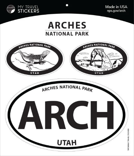 Where does the ARCH abbreviation come from? The National Park Service assigns a unique abbreviation to each park unit to help standardize communications both internally and externally. One of the smaller stickers shows a collared lizard and the other is of Landscape Arch.